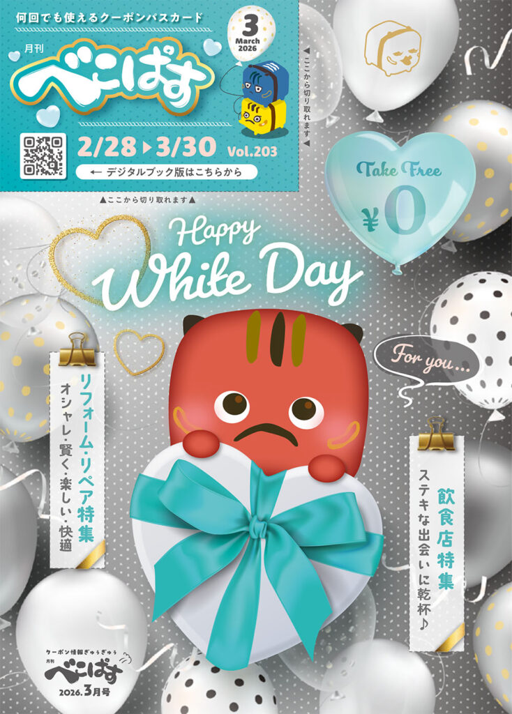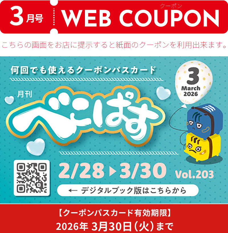 2026年2月28日 / 最終更新日 : 2026年2月27日 timely デジタルブック 月刊べこぱす 3月号 デジタルブックで見る 使用上の注意 ○3月号の掲載店でご使用頂ける共通のクーポンパスカードです。○WEBクーポンパスカードアイコンが付いている掲載店のみ対象です。 〇期間中は何回でもご利用頂けます。○クーポンパスカードは、原則として1名様のみ有効となりますが、特典内容、有効人数などの使用条件はお店により異なりますので、お確かめの上ご利用下さい。 ※有効期限が切れたクーポンパスカードは使用できません※新型コロナウイルスの感染状況によって、お店の掲載内容が変更になっている場合もございます。